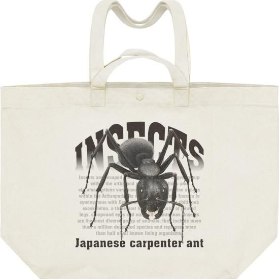 当店最大サイズのトートバッグです。持ち手が肩掛けと手持ちの二種類。袋口にドットボタン。内ポケット付き。