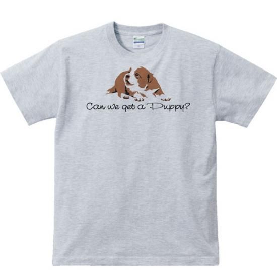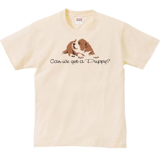 小犬のシンプルなイラストです。<ロゴ部分> Can we get a puppy?(子犬を飼ってもいい?)<タグ:イヌ いぬ こいぬ>